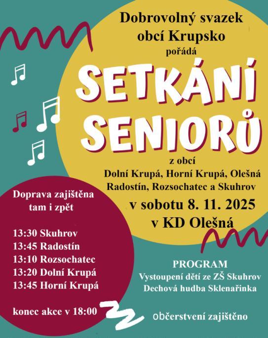 Dolní Krupá Hlavní stránka / Aktuality / SETKÁNÍ SENIORŮ (věk 65+) KD SKUHROV sobota 8.11.2025